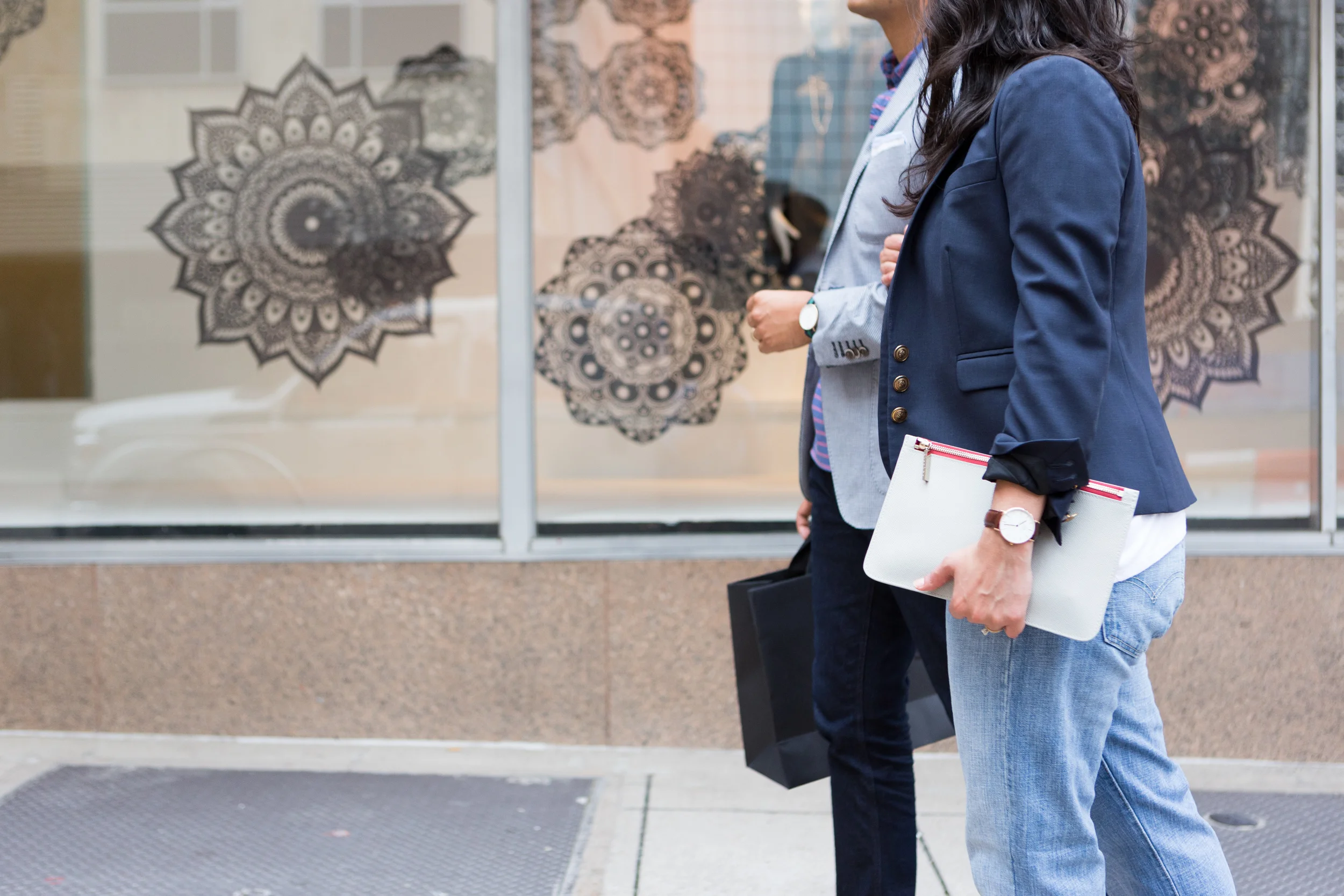 HER: Blazer: Madewell (this one is a must!) | Shirt: Tildon (even this one) | Jeans: Levis | Heels: Sam Edelman | Watch: Daniel Wellington | Sunglasses: Ray-Ban | Clutch: One Truffle