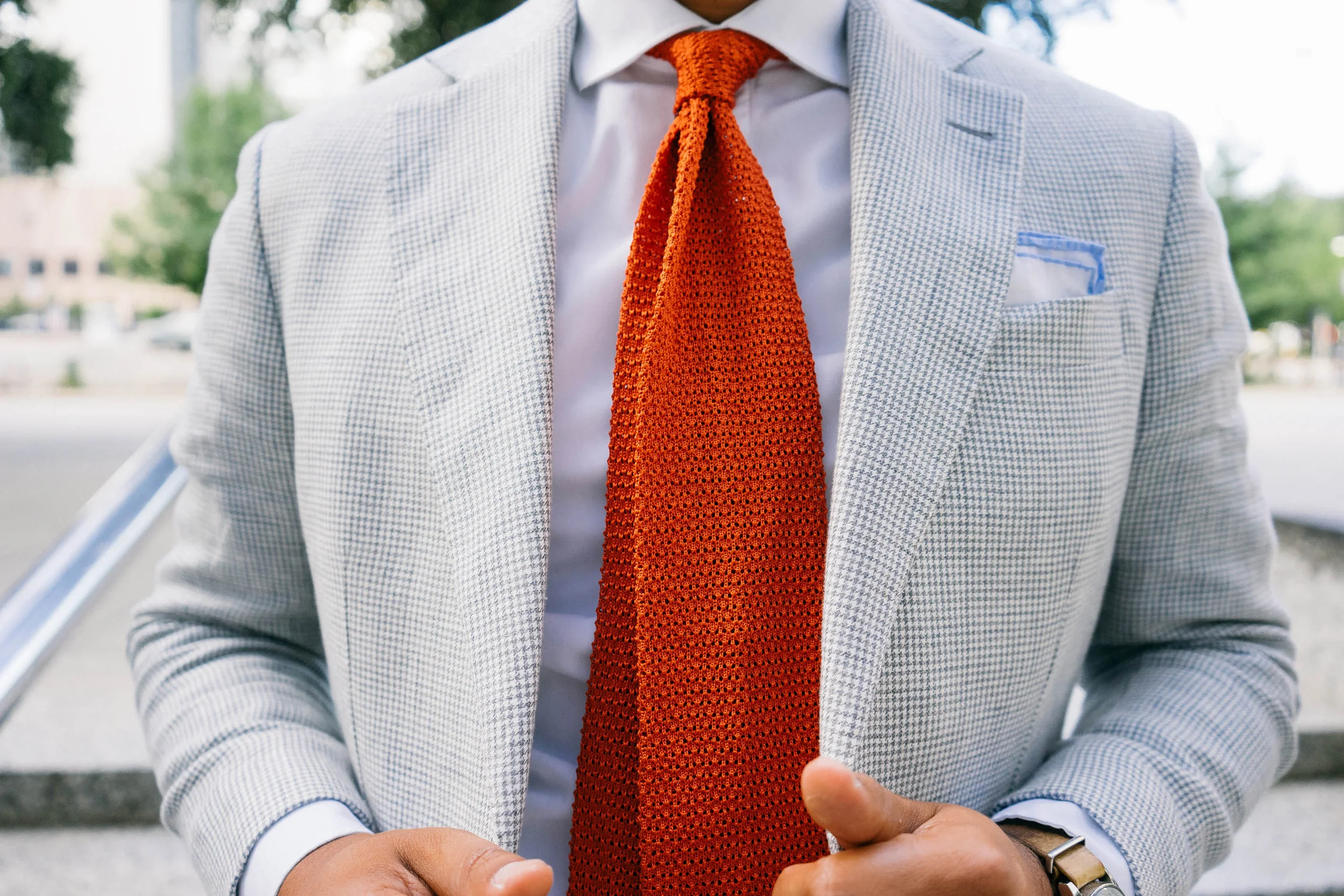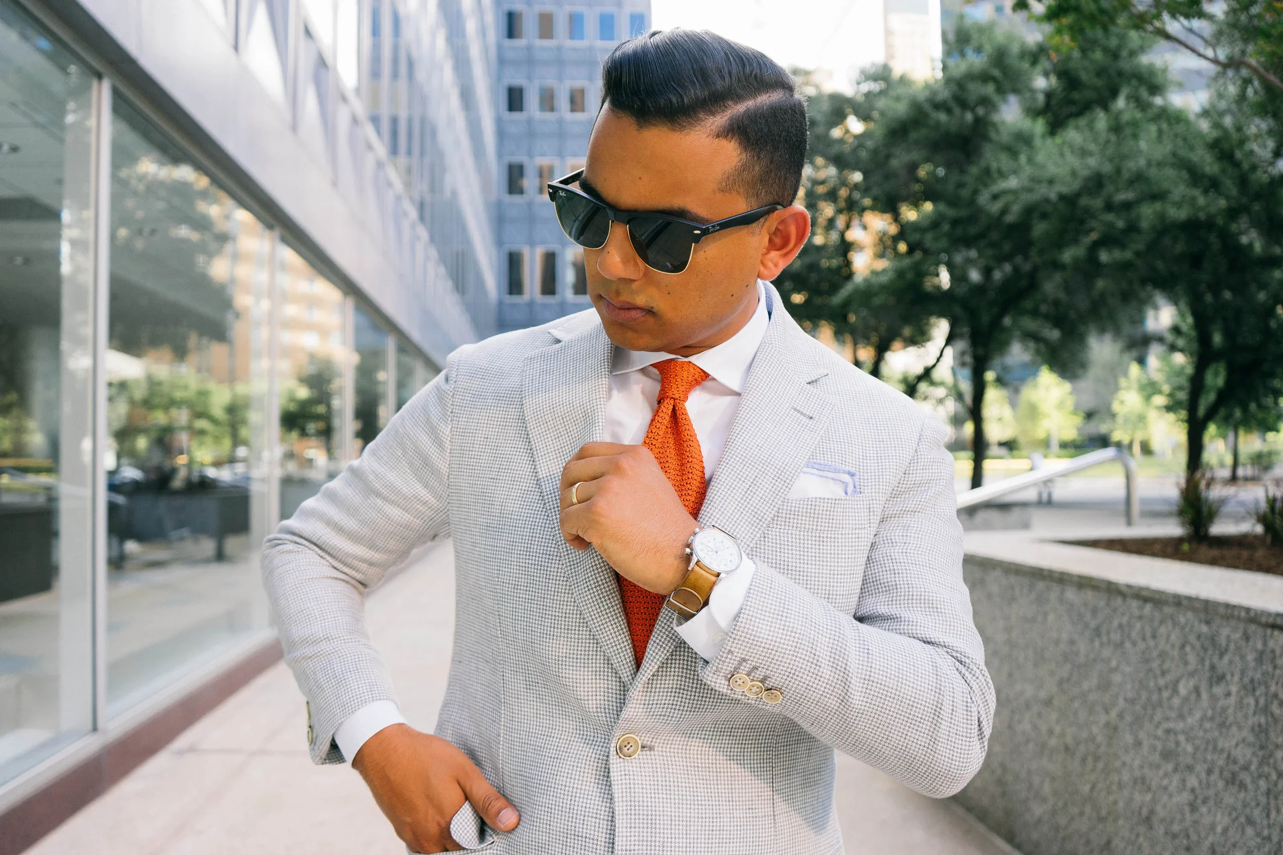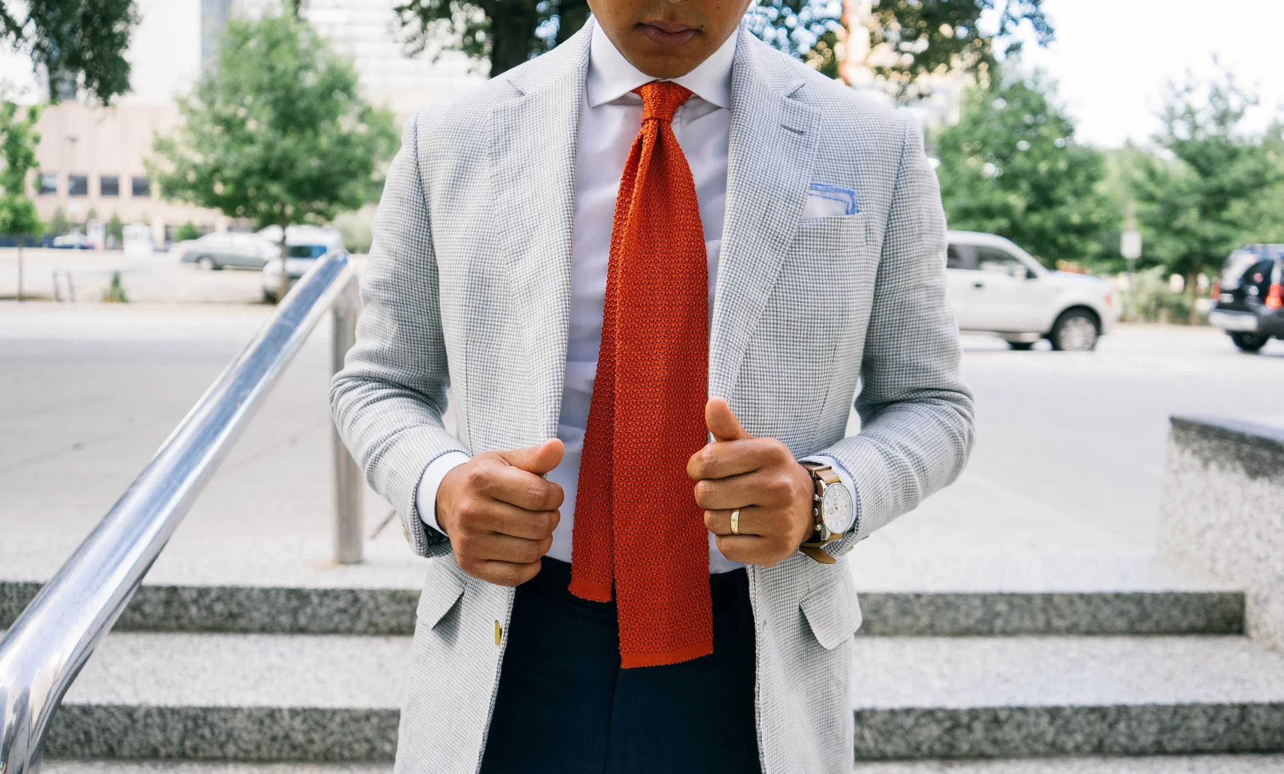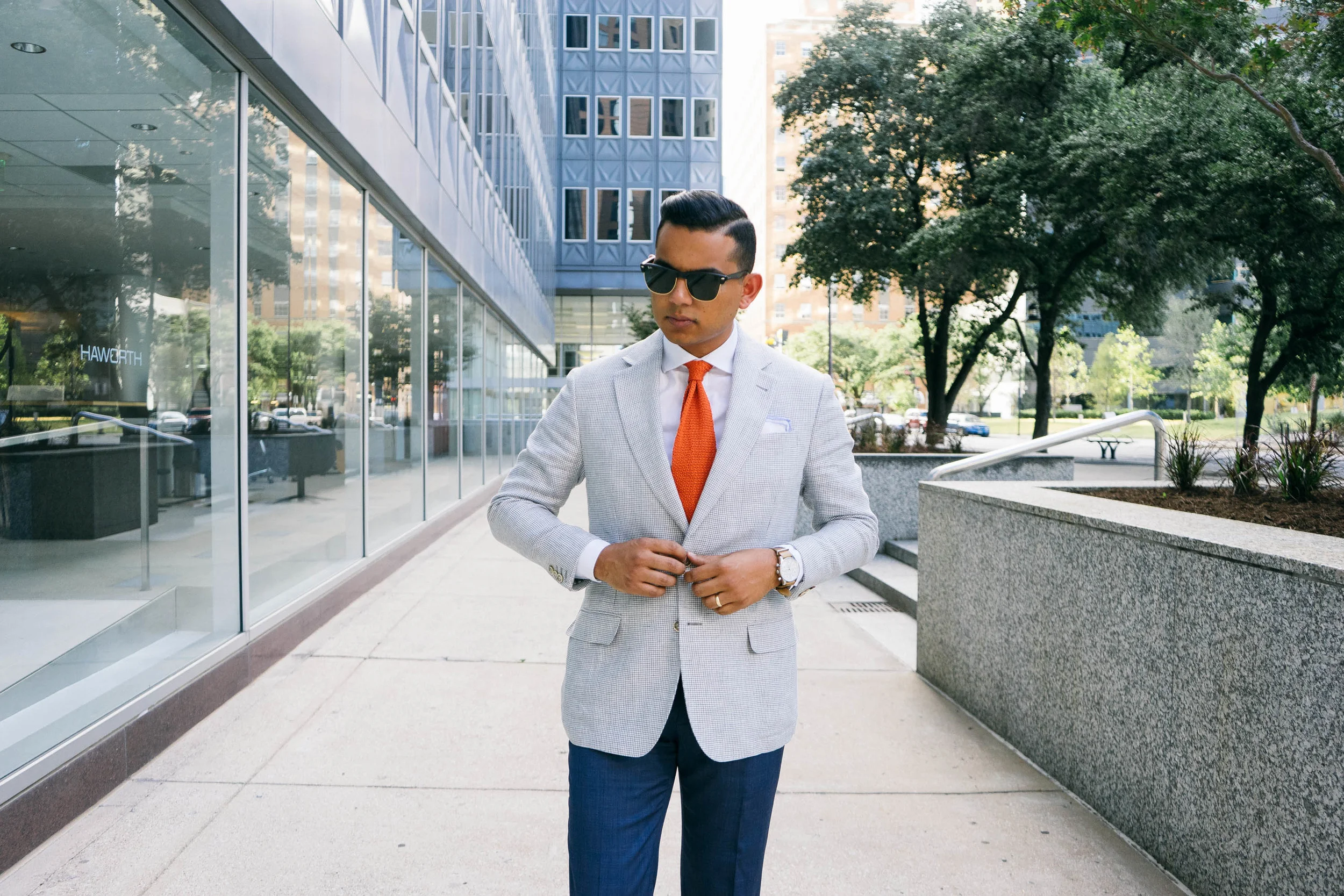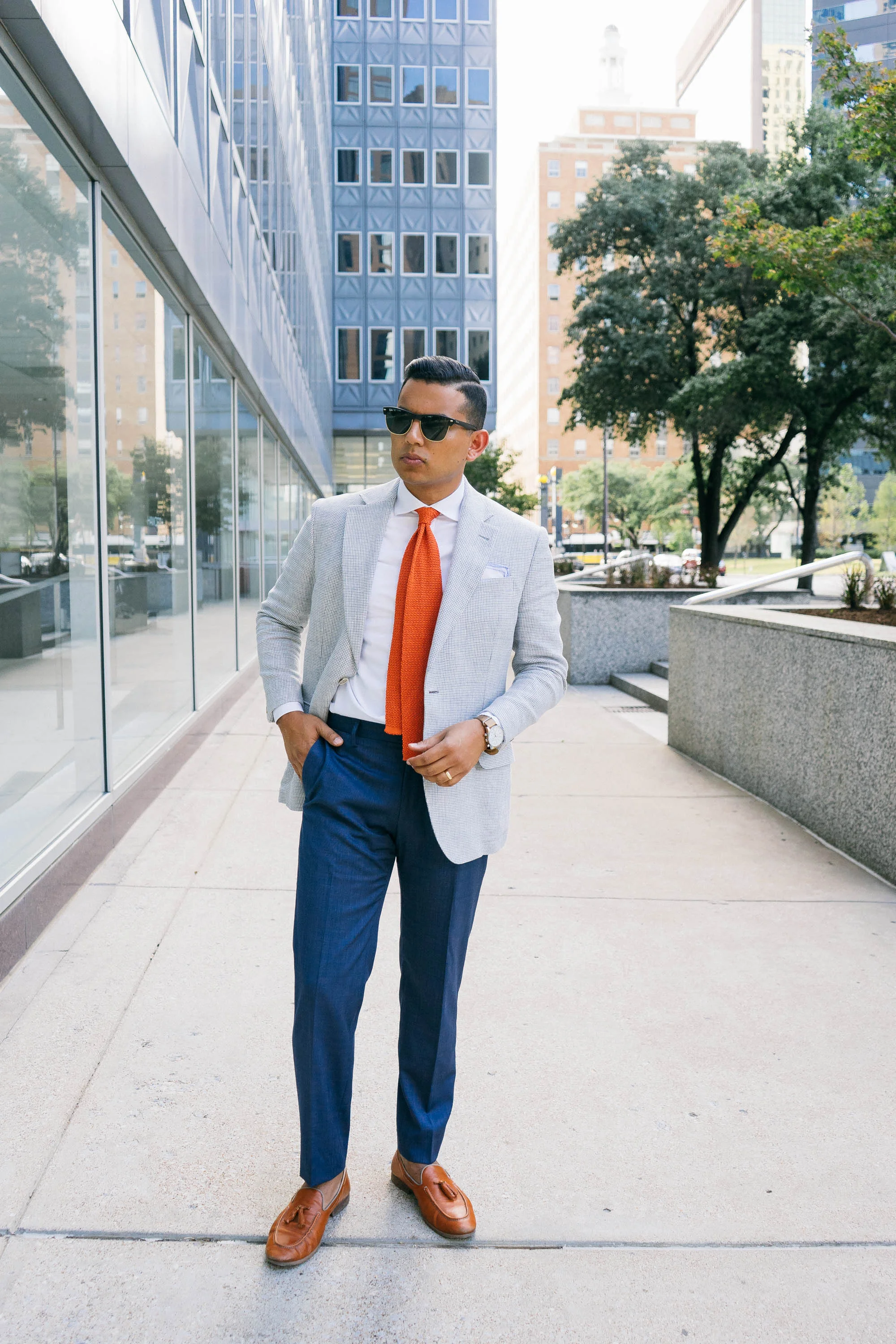As a designer, I am a firm believer of Mies Van Der Rohe's notion that "less is more". However, when it comes to menswear, I usually stray from this and actively seek opportunities for layering, pattern mixing, etc. This outfit seems to lean toward the former at first glance, but offers some subtle complexity upon closer investigation. Though not my intention, this entire ensemble is kind of centered around this tie. The solid orange tie bears a knit texture which is complemented by these blue trousers in color and micro-houndstooth linen jacket in texture/pattern. Even the width of this tie plays a major influence on today's look: usually more narrow, this knit tie is rather wide which begs to be paired with a jacket whose lapels are comparable. Because it's knit, the tie brings down the level of formality, making me feel comfortable leaving my belt at home. And as (almost) always this summer, I've opted out of wearing dress socks.