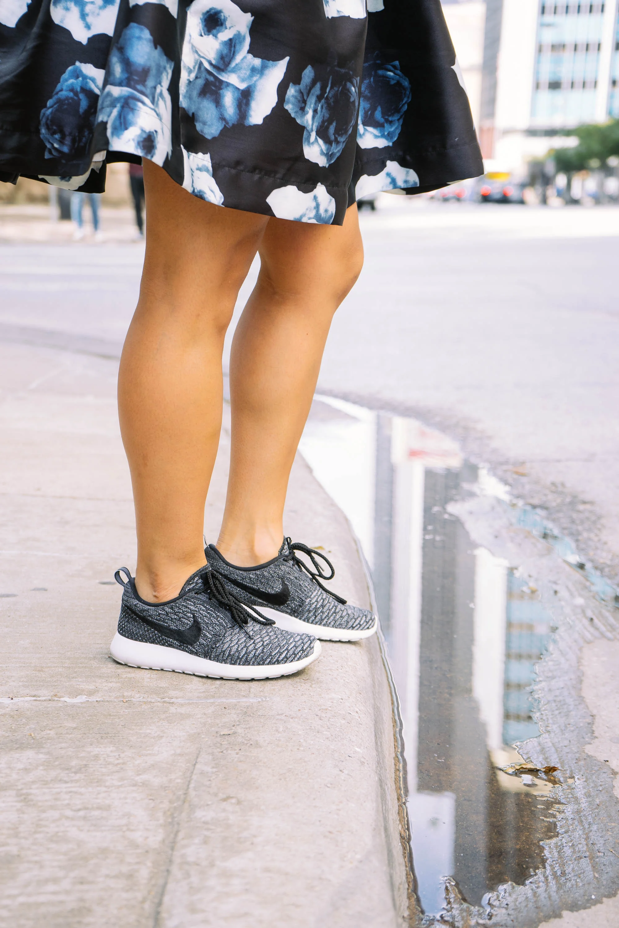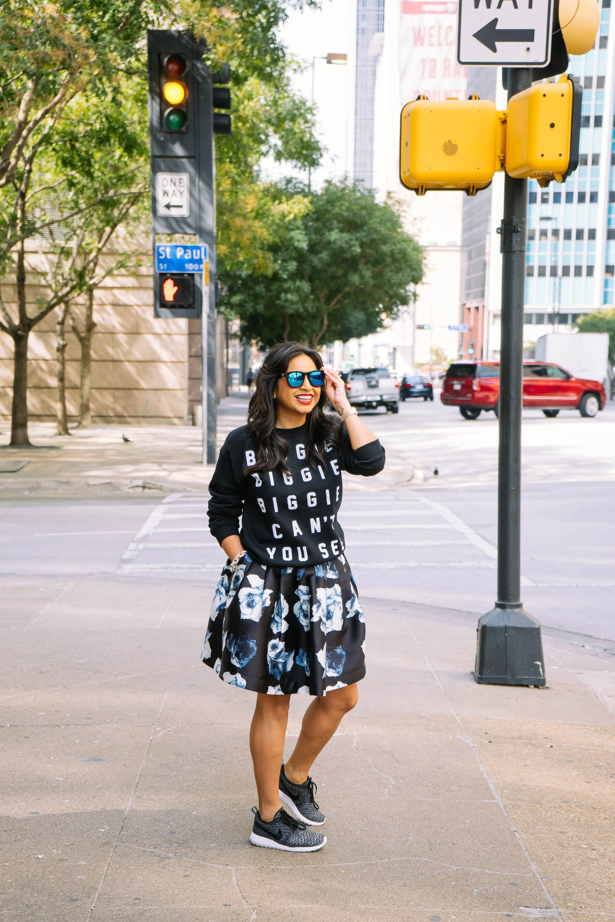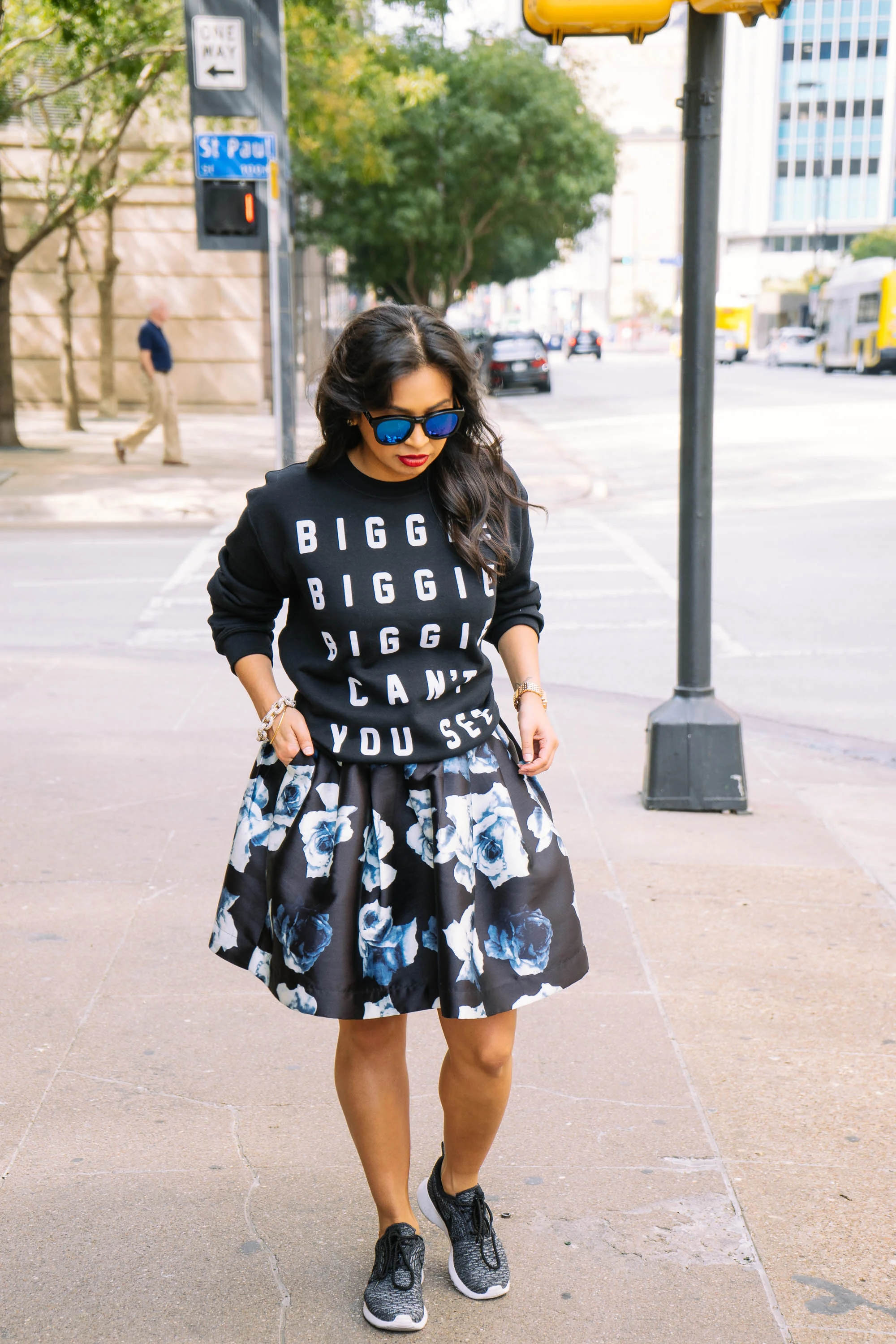 I immediately knew how I wanted to sport it out on the streets. I had to add femininity to this oversized sweater with my floral print skirt. Oh, and you can't forget the sneakers! If you want to up the ante, you could totally wear some retro Dunks or Jordan's with this little number "for your flashy ways."