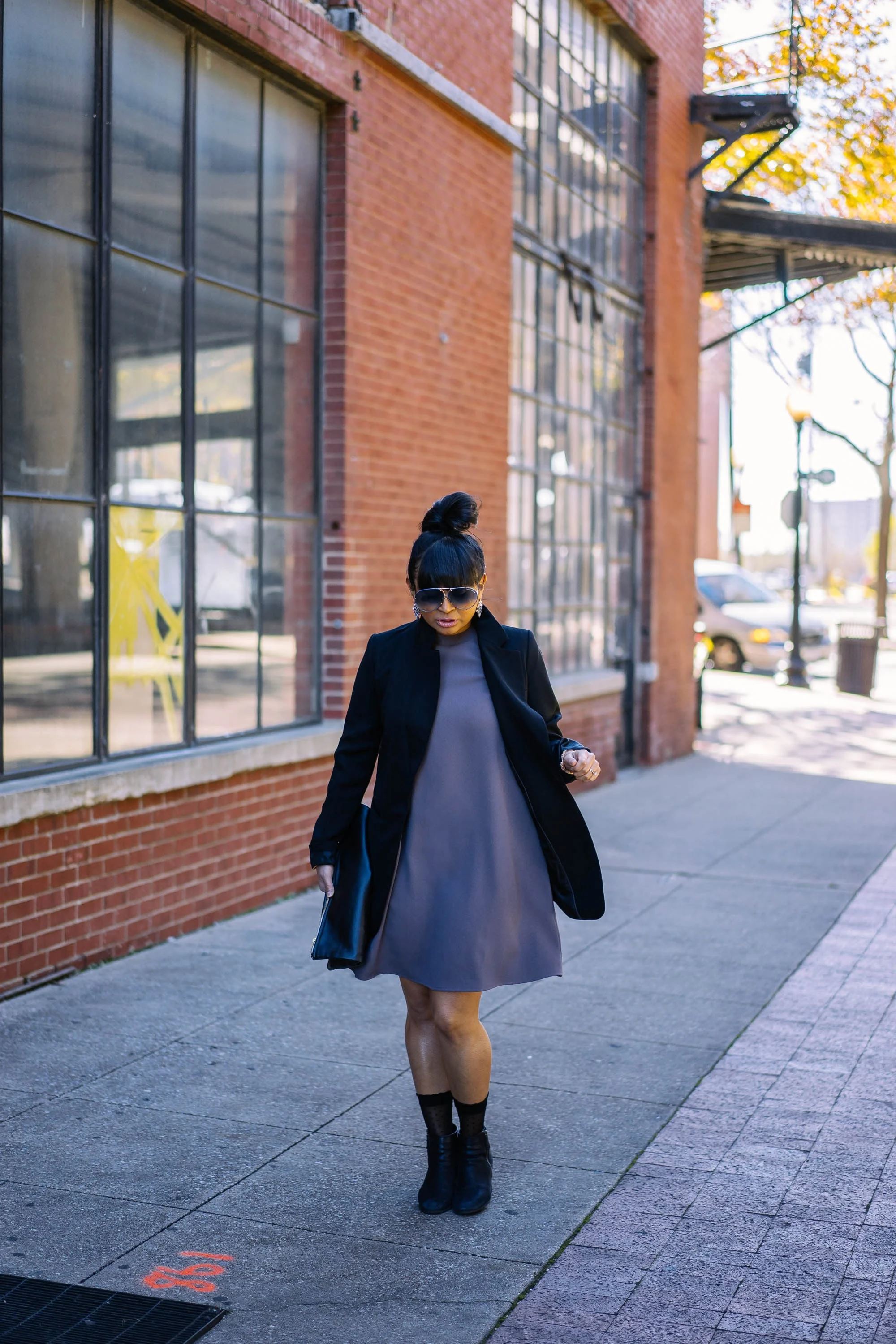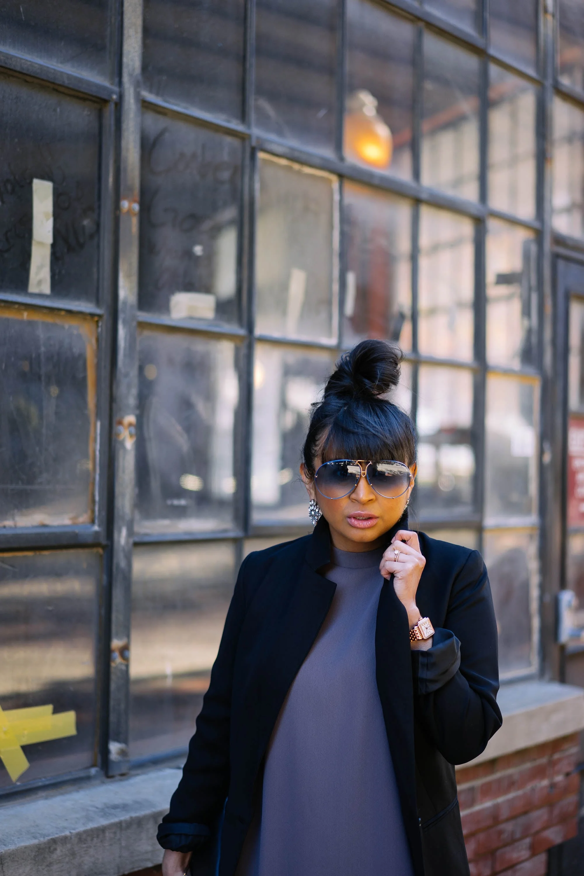 Dress: Everly (Movida | diggin' this one) | Jacket: H&M (similar here) | Boots: B.P. | Hosiery: XXI | Sunglasses: Porsche Design (vintage | I heart these) | Watch: Michele | Earrings: Accessory Concierge | Handbag: American Apparel (love this one!)