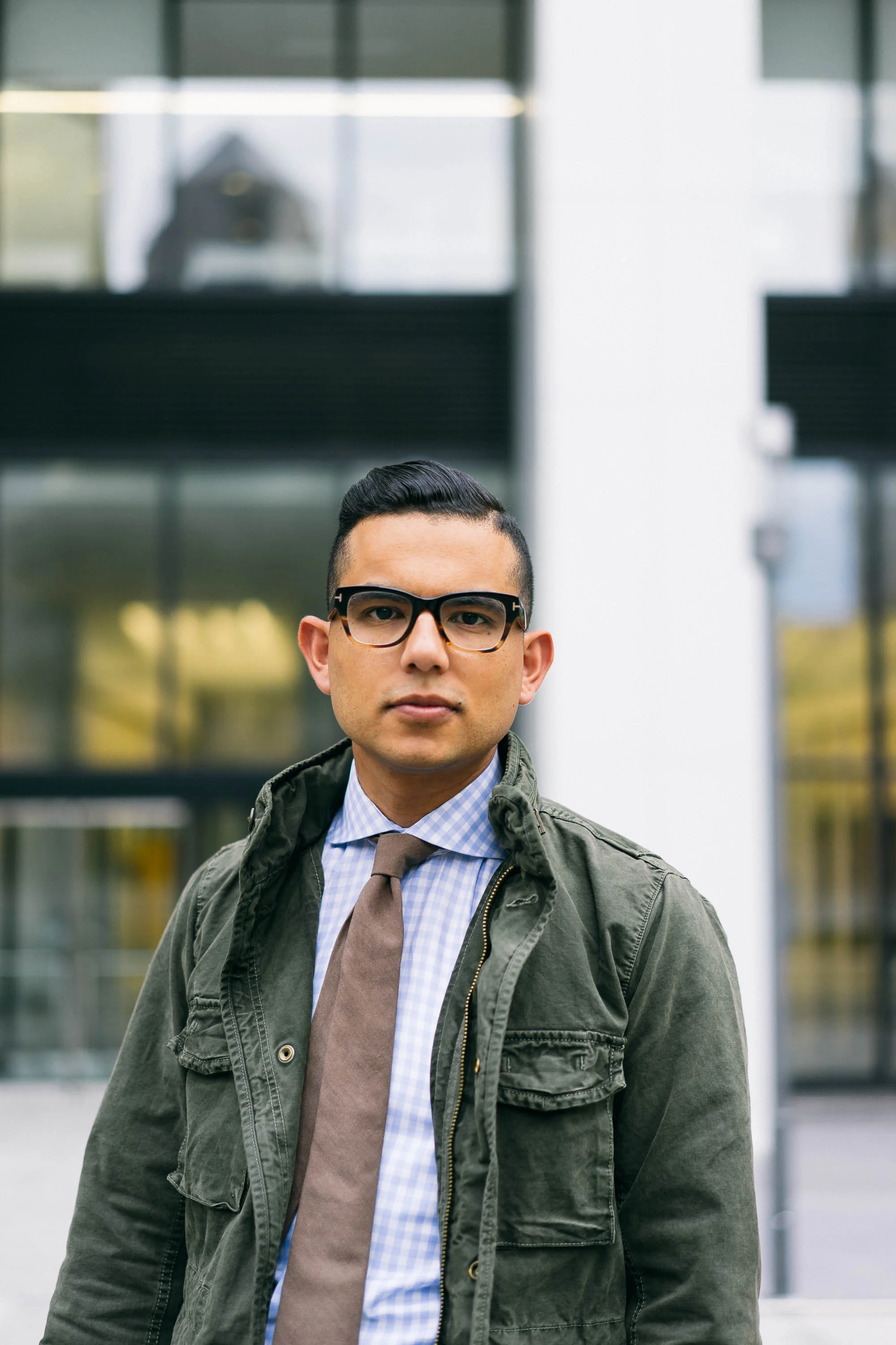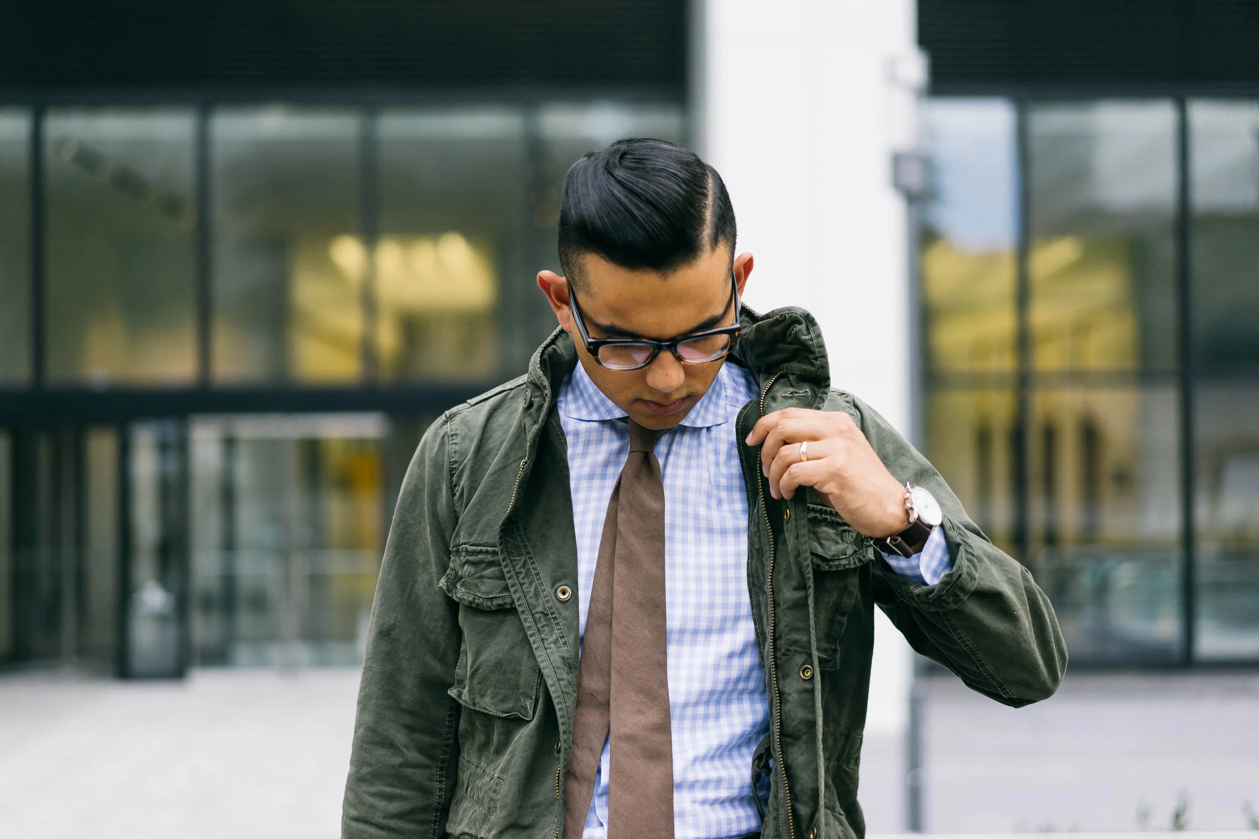 Jacket: Gap | Shirt: Suitsupply (just like this one) | Tie: Brunello Cucinelli (also dig this one) | Jeans: H&M | Boots: Johnston & Murphy | Belt: Suitsupply (similar) | Watch: Lucien Piccard (check out this one) | Glasses: Tom Ford | Bag: Will Leather Goods