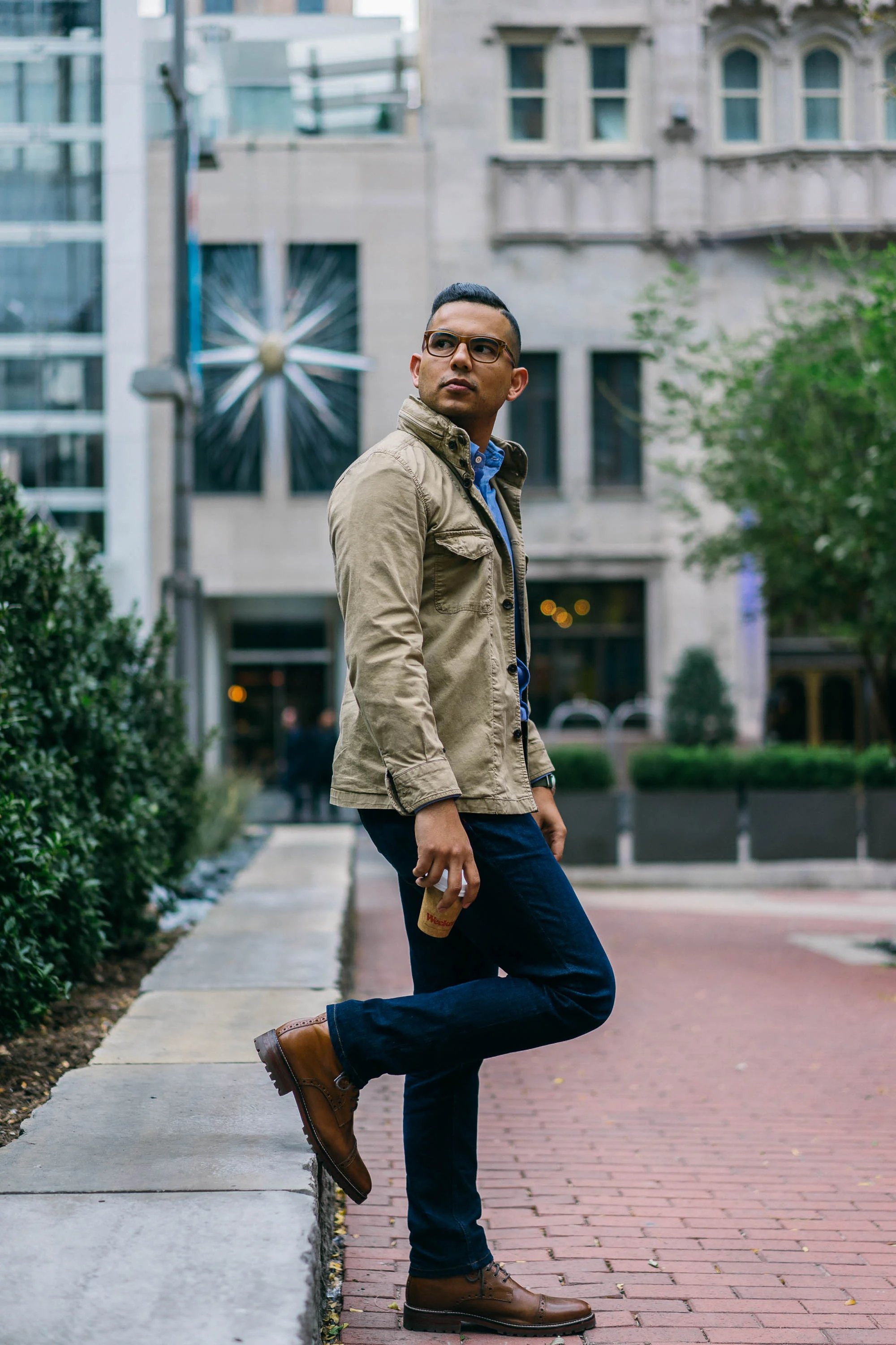Jacket: American Eagle (similar here) | Shirt: Kiton | Jeans: H&M | Boots: Johnston & Murphy | Belt: Suitsupply | Glasses: Moscot (just like these) | Watch: Shinola