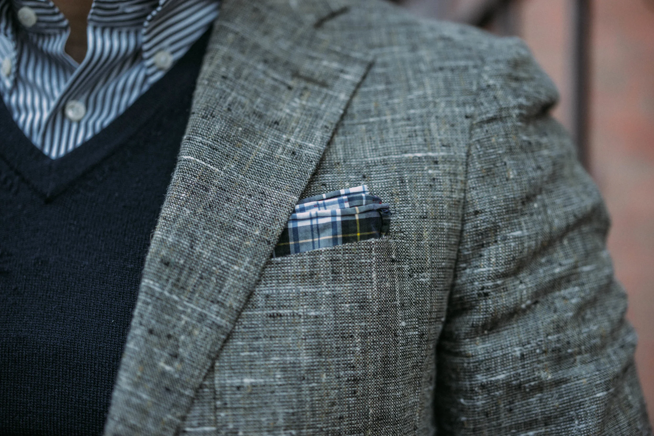 Now take this jacket as an example. Its earthy green color allows it to span all seasons, its light weight makes it perfect for spring/summer, and its texture is not unlike all my flecked wool trousers. For today's look, I layered it with a medium weight sweater that's easy to shed in the event the temperature creeps into the 70s by the afternoon (now, could you imagine that happening?)