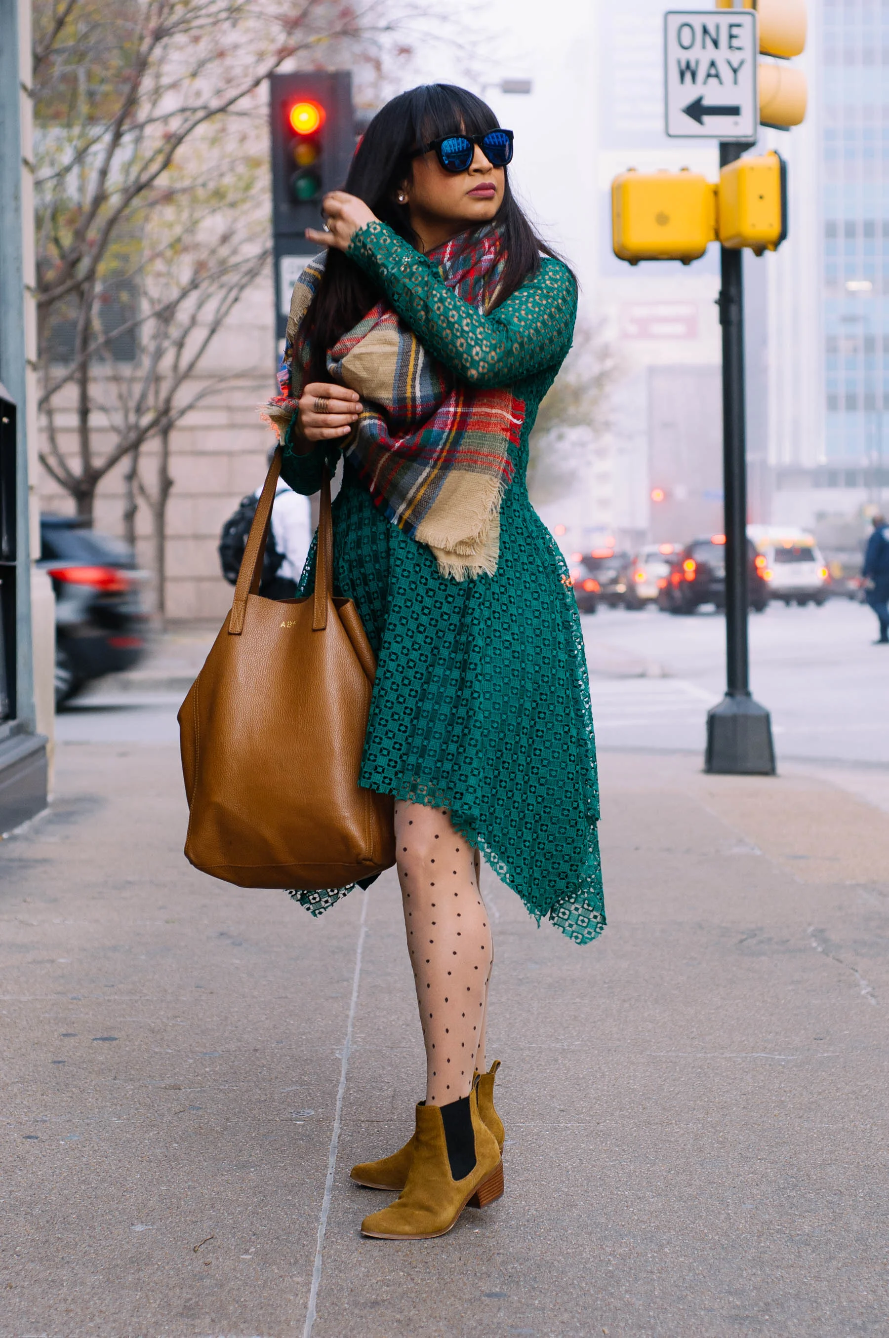 Dress: H&M (similar here; also love this one!) | Scarf: Accessory Jane (similar here) | Boots: Topshop | Hosiery: Nordstrom | Tote: Cuyana (just like this one) | Sunglasses: Wildfox | Ring: Forever21 (similar here) | Watch: Michele | Earrings: Anthropologie | Lip: Stila 'Patina'